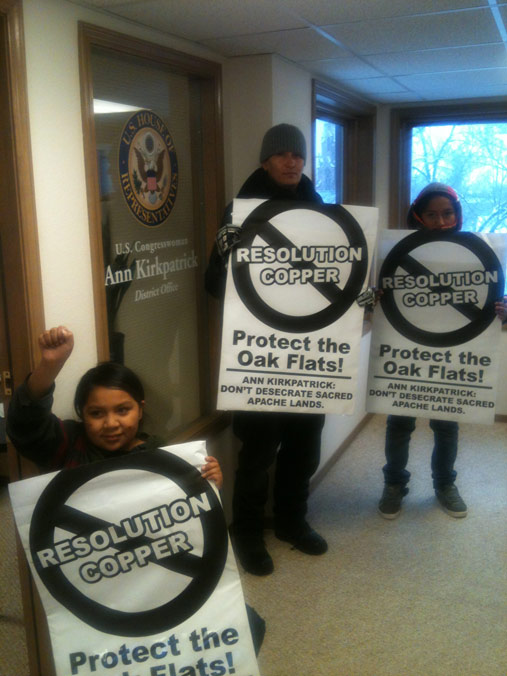 FLAGSTAFF, Arizona – une poignée de manifestants Diné à Flagstaff ont demandé à la membre du Congrès Ann Kirkpatrick de « dire Non au projet Resolution Copper ! Protégez Oak Flat et cessez la destruction et la profanation de terres Apaches ! »