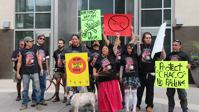 . Nous sommes unis pour protester contre le projet de Saddle Butte de construire son oléoduc près de nos terres sacrées du canyon de Chaco et contre la destruction causée par la fracturation à nos précieuses eaux potables souterraines