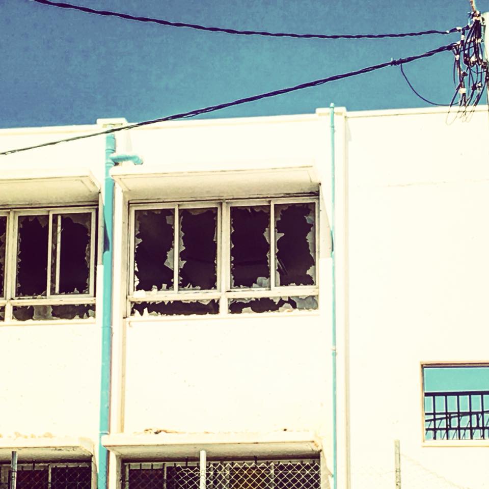 Les fenêtres d’une école de filles Palestinienne, brisées par des balles en caoutchouc et des grenades lacrymogènes par l’armée Israéliennne