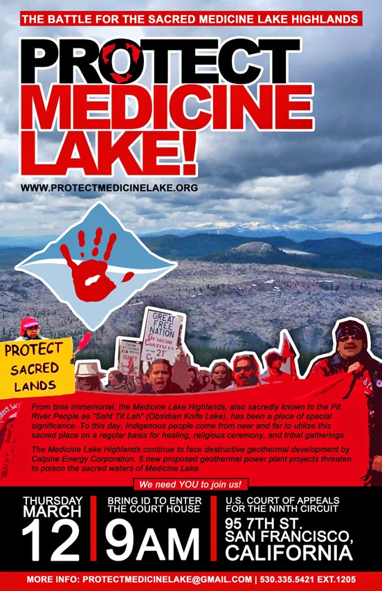 SAN FRANCISCO, Californie – Mardi 12 mars 2015, une cour d’appel fédérale entendra les arguments au cours d’une bataille légale pour protéger les hauteurs sacrées de Medicine Lake de menaces de profanation géothermique. Les hauteurs de Medicine Lake sont sacrées pour les nations de Pit River, Wintu, Karuk, Shasta et Modoc.